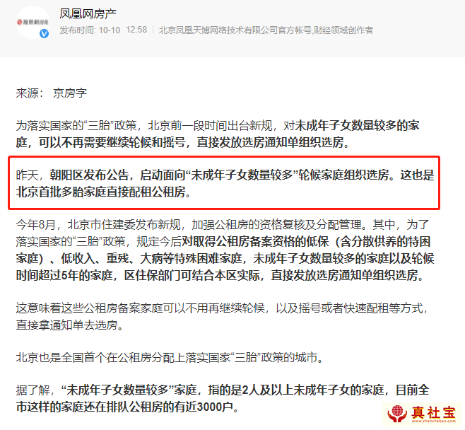 為落實(shí)國家的“三胎”政策,北京前一段時(shí)間出臺(tái)新規(guī),對未成年子女?dāng)?shù)量較多的家庭,可以不再需要繼續(xù)輪候和搖號,直接發(fā)放選房通知單組織選房。