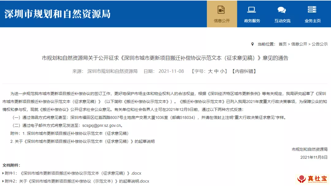 11月8日,深圳市規(guī)劃和自然資源局官方網(wǎng)站發(fā)布了公開征求《深圳市城市更新項目搬遷補償協(xié)議示范文本(征求意見稿)》意見的通告。