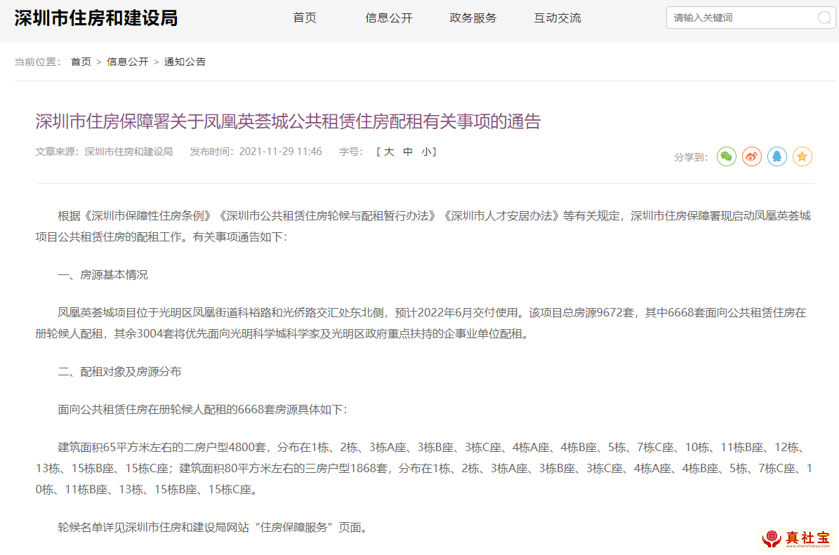 深圳市住房保障署關(guān)于鳳凰英薈城公共租賃住房配租有關(guān)事項(xiàng)的通告