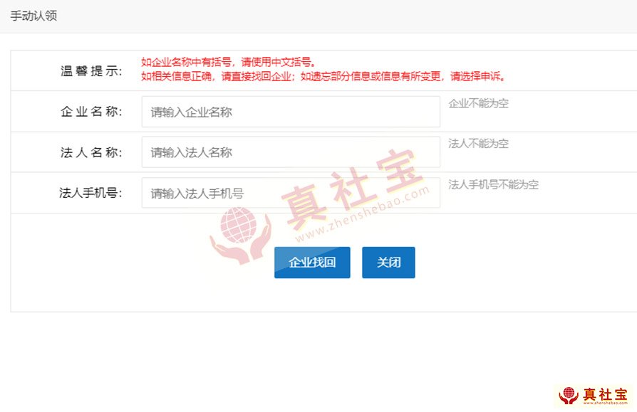2.點(diǎn)擊“企業(yè)認(rèn)領(lǐng)”欄目中的[手動找回企業(yè)],在彈框中填寫舊系統(tǒng)中最后一次辦結(jié)的企業(yè)相關(guān)信息,然后點(diǎn)擊[企業(yè)找回],即可完成認(rèn)領(lǐng)。認(rèn)領(lǐng)成功后,請及時(shí)更新完善企業(yè)信息。