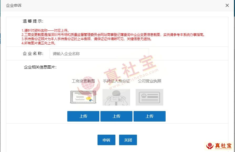 申訴所需材料:營業(yè)執(zhí)照復(fù)印件加蓋公章圖片、法定代表人手持身份證圖片、工商信息變更截圖。