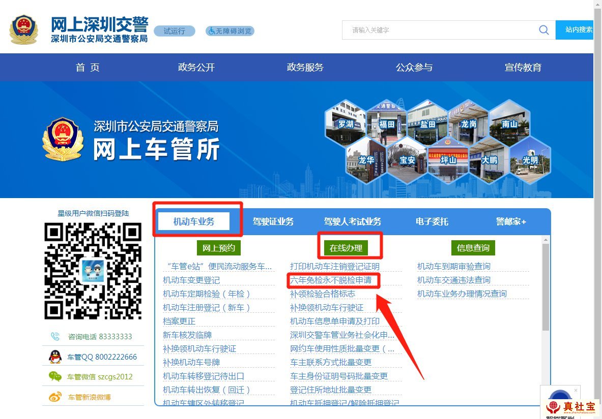 第一步:打開(kāi)“深圳交警網(wǎng)上車(chē)管所”官網(wǎng),點(diǎn)擊“機(jī)動(dòng)車(chē)業(yè)務(wù)”-“在線辦理”中的“六年免檢永不脫檢申請(qǐng)”進(jìn)入申請(qǐng)頁(yè)面