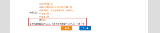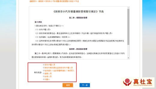 請閱讀《深圳市小汽車增量調(diào)控管理暫行規(guī)定》,然后【選擇】相應(yīng)身份類型,確認(rèn)無誤后,點(diǎn)擊【下一步】,進(jìn)入申報(bào)信息填寫界面。
